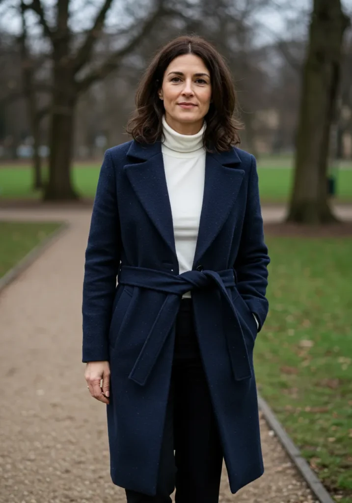 A navy wrap coat layered over a cream turtleneck creates a clean, sophisticated look. The belted waist adds structure, and the soft fabric drapes beautifully for an effortlessly elegant finish. Simple, refined, and perfect for cooler days.
