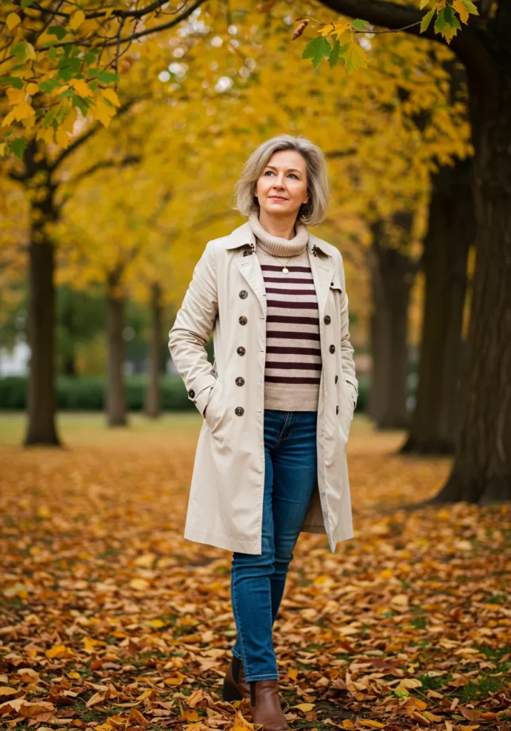 This outfit layers a striped turtleneck sweater under a beige trench coat, styled with slim blue jeans and ankle boots. The combination feels classic yet playful, giving off that perfect fall stroll aesthetic.