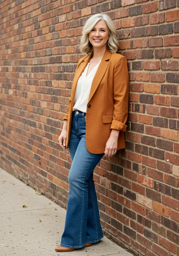 This chic look pairs a burnt orange blazer with a crisp white blouse and high-rise blue jeans. The tailored jacket adds structure, and the rich color instantly brightens the outfit. Paired with simple brown flats, it’s casual yet polished.