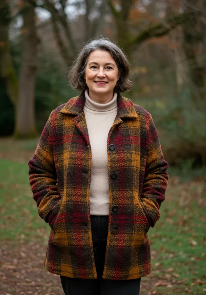 This cozy outfit layers a warm-toned plaid jacket over a beige turtleneck and black trousers. The jacket’s mix of burgundy, mustard, and brown captures the essence of fall, while the soft knit underneath keeps it snug and stylish.
