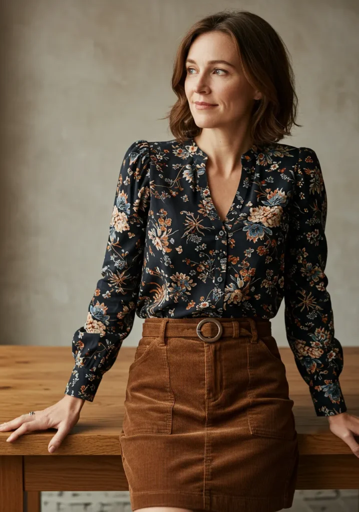 This stylish combo features a navy floral blouse tucked into a brown corduroy mini skirt with a belt accent. The blend of soft fabric and structured lines gives it a charming, retro-inspired vibe that feels perfect for autumn.