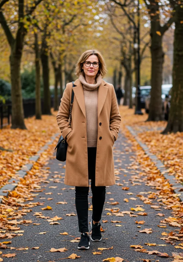 This timeless fall outfit pairs a camel wool coat with a chunky beige turtleneck, black pants, and black sneakers. The neutral tones create a sleek, city-chic look that’s both practical and elegant.
