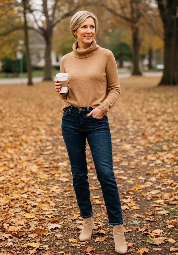 This simple yet flattering outfit pairs a camel-colored turtleneck sweater with dark blue jeans and beige ankle boots. The look is minimal, but the colors are so warm and rich that it feels effortlessly pulled together.