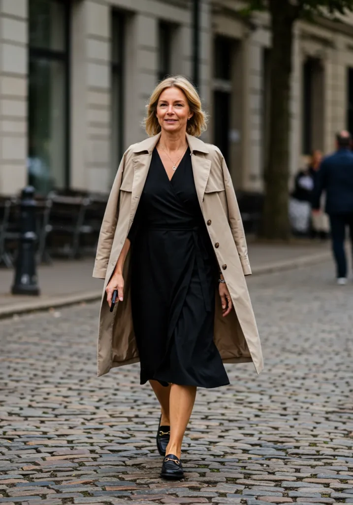 A timeless black wrap dress paired with a beige trench coat creates a sleek, city-ready look. The flowy fabric of the dress flatters the figure, while the trench adds a tailored edge perfect for transitional weather. Black loafers complete the ensemble with understated sophistication.