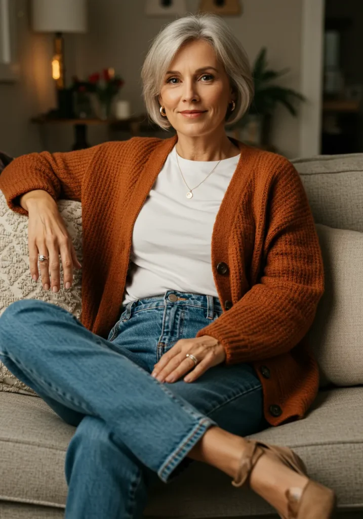 This casual look pairs a rust-orange cardigan with a cream blouse, blue jeans, and a leather crossbody bag in a matching tone. The warm hues and soft textures make it a great everyday outfit for fall. It’s cozy, practical, and still very chic.