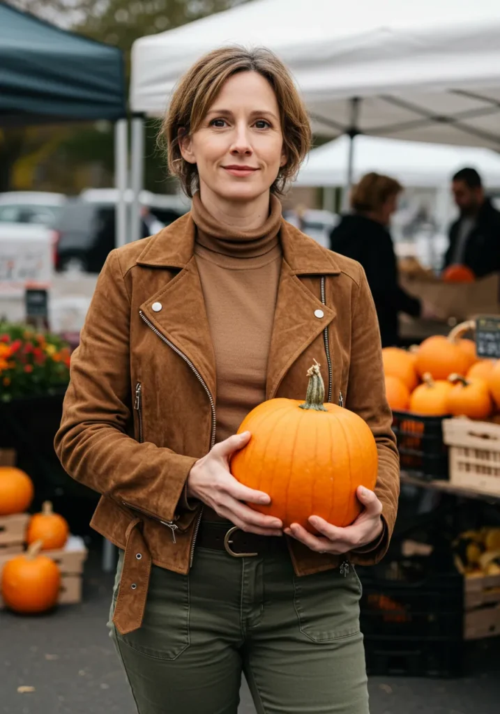 Here’s a chic earthy outfit featuring a tan suede moto jacket layered over a camel turtleneck, paired with olive green pants. The combination feels grounded and seasonal, with warm brown tones perfectly matching the fall backdrop.