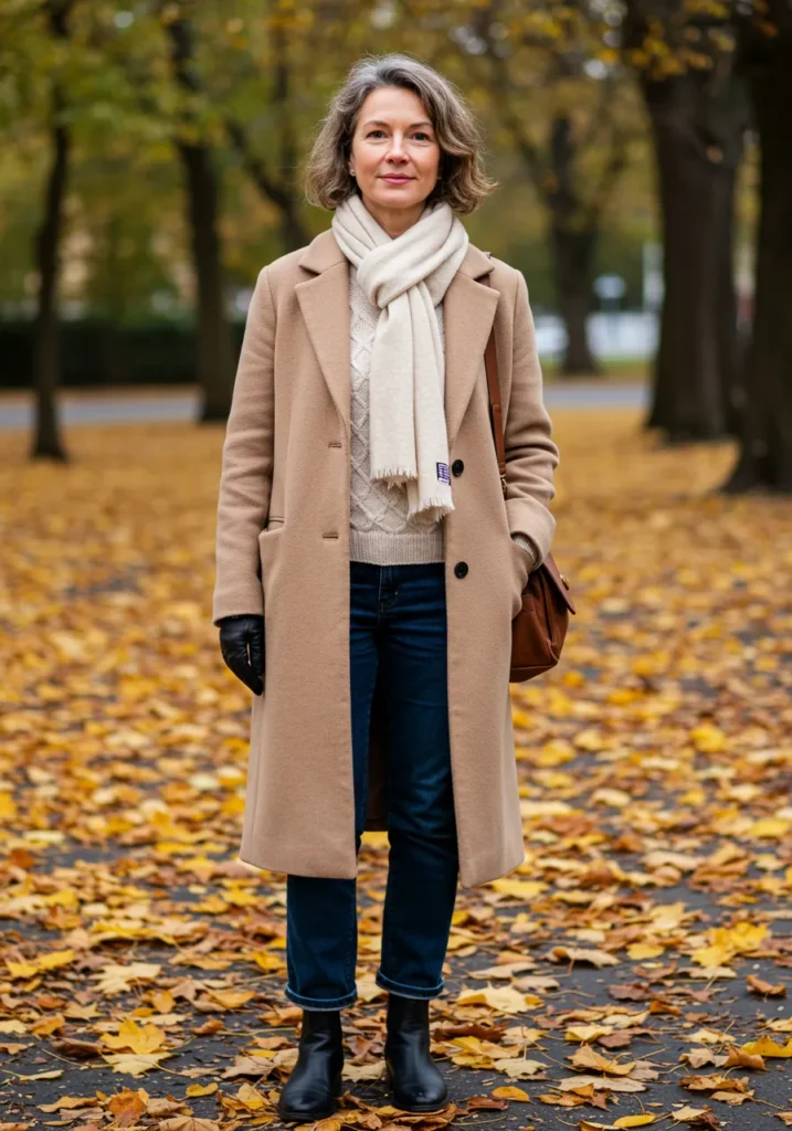 A long camel coat styled with a cream sweater, matching scarf, and dark denim creates a clean, classic look. The neutral palette feels soft and elevated, perfect for crisp fall days. Black ankle boots and gloves complete the look with subtle contrast.