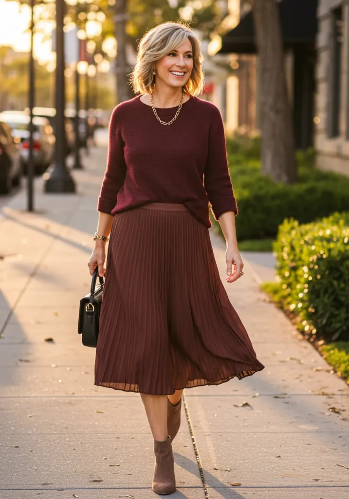 This stylish outfit combines a burgundy sweater with a flowy pleated skirt in a matching tone, finished with taupe ankle boots. The monochrome approach feels rich and seasonal, while the soft knit adds warmth.
