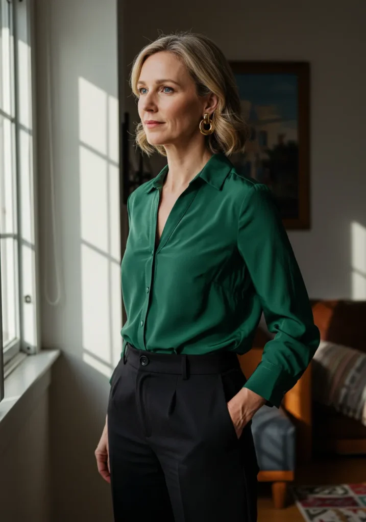 This elegant look features a silky emerald green blouse tucked into high-waisted black trousers. The shirt’s smooth sheen catches the light beautifully, while the structured pants balance it with a polished finish. Gold hoop earrings tie everything together with a hint of understated glamour.