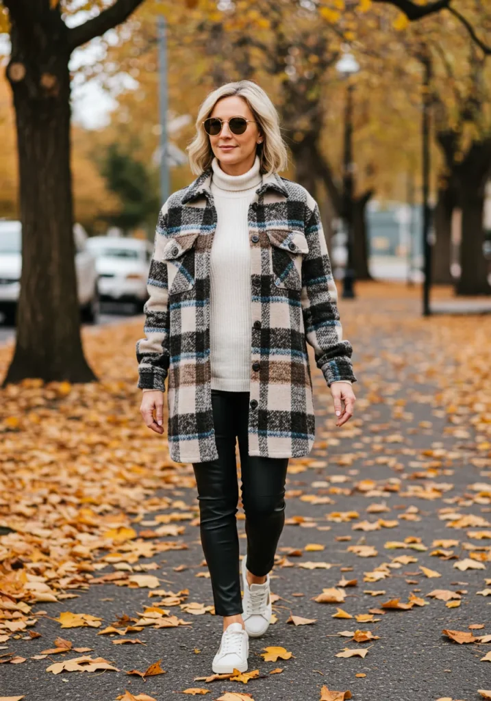 This look feels like autumn wrapped in a hug. The cozy plaid shacket brings that rustic charm, layered over a soft cream turtleneck that keeps things snuggly without trying too hard. Paired with sleek black leather leggings and white sneakers, it strikes the perfect balance between casual comfort and a hint of edge. It’s the kind of outfit that makes you want to grab a pumpkin spice latte and stroll through crunchy leaves.