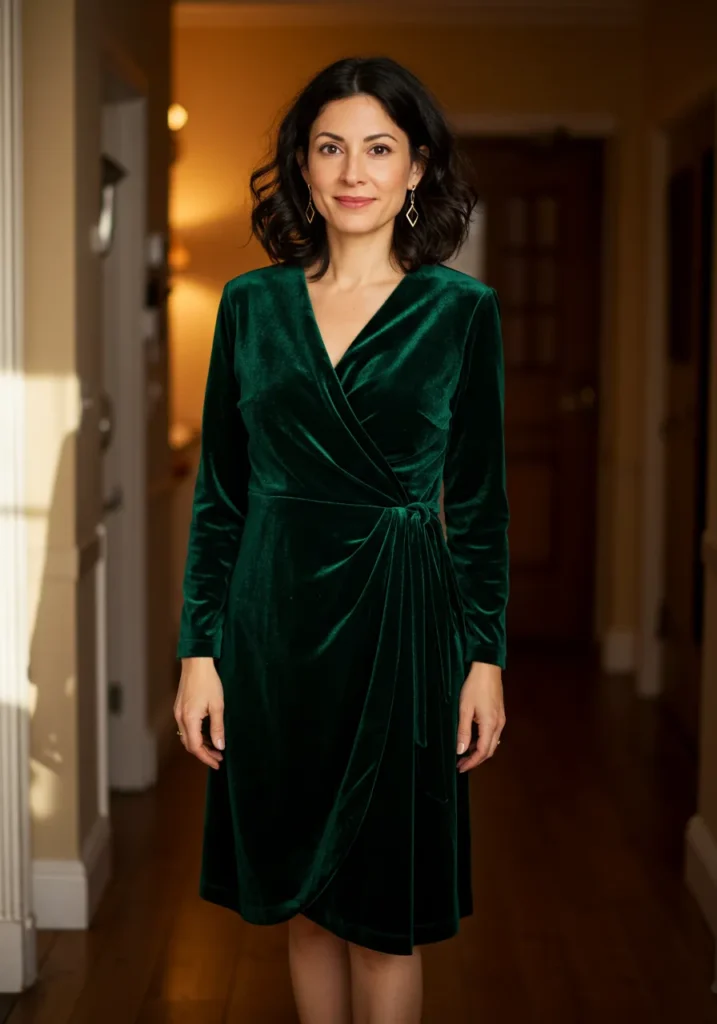 This deep green velvet wrap dress is pure elegance. The soft fabric catches the light beautifully, and the tie waist gives a flattering, feminine shape. Long sleeves make it perfect for cooler evenings without needing a jacket.