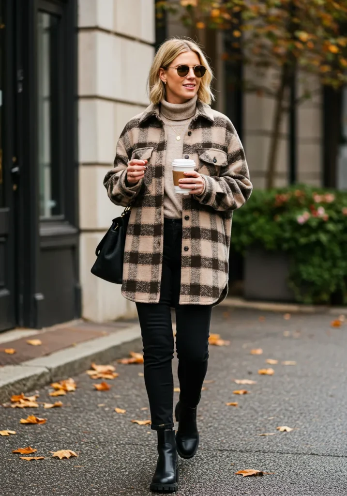 A beige-and-brown plaid shacket layers over a turtleneck sweater and slim black jeans, finished with chunky black boots and gold accessories. It’s relaxed, practical, and full of fall attitude.