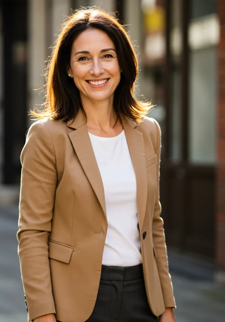 A tailored camel blazer worn over a crisp white tee and charcoal trousers keeps things simple and sharp. It’s an understated outfit that looks instantly refined without trying too hard.
