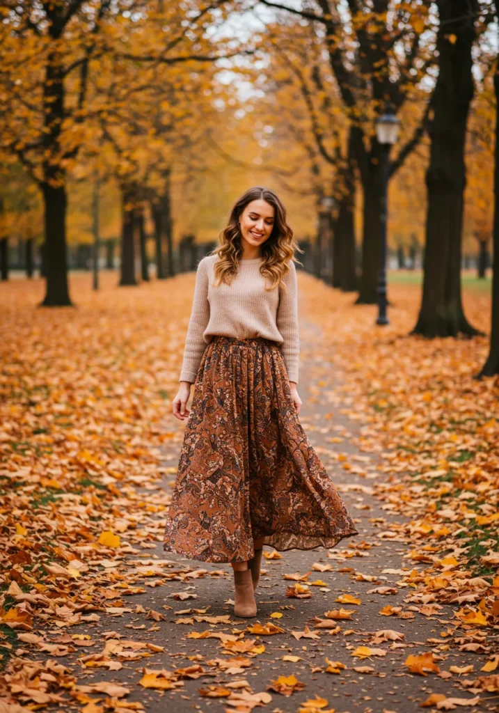 A light beige sweater paired with a flowing brown paisley maxi skirt creates a soft, romantic fall look. The earthy tones blend perfectly with the golden leaves, and suede ankle boots finish off the outfit beautifully.