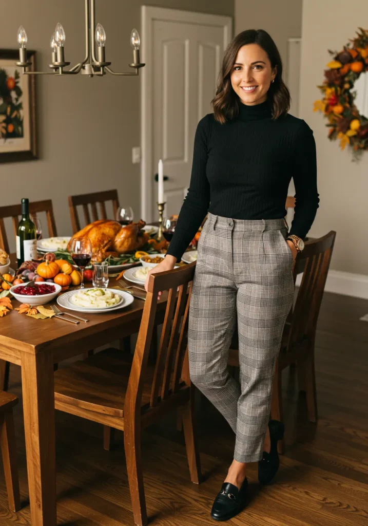 This classic outfit mixes a fitted black turtleneck with high-waisted gray plaid trousers and black loafers. It’s timeless and polished, yet still comfortable enough for a long dinner with family and friends.