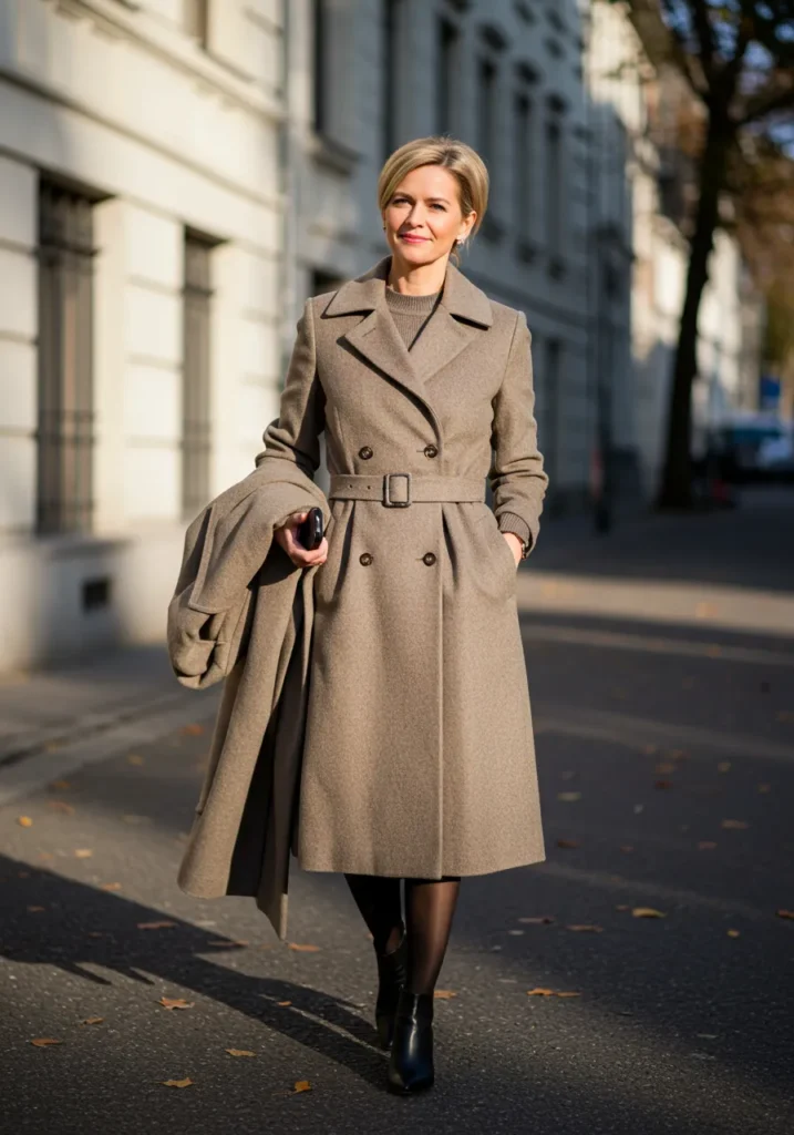 A belted taupe wool coat styled with sheer tights and ankle boots gives off an elegant and refined vibe. The structured cut and muted tone make it a true cold-weather staple that still feels festive enough for the holiday season.