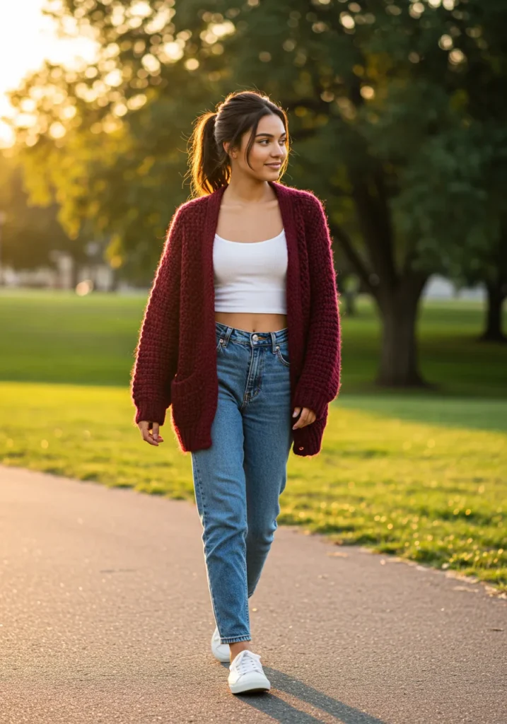 A chunky burgundy cardigan layered over a white crop top and light blue jeans keeps things casual yet stylish. White sneakers complete the look, giving it an easy, relaxed vibe that still feels pulled together.