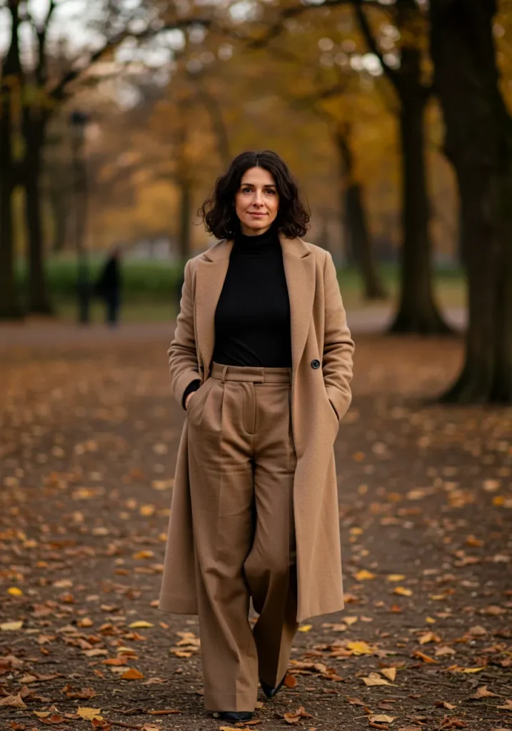 Effortlessly Elegant in a Camel Coat and Wide-Leg Trousers