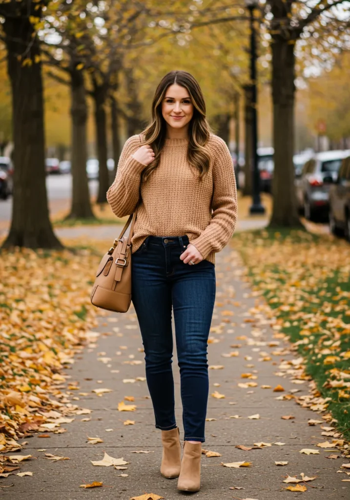 A warm camel sweater tucked into dark skinny jeans, paired with tan ankle boots and a matching handbag, makes this outfit the ultimate cozy fall staple. The simple pairing feels both modern and effortlessly cute.