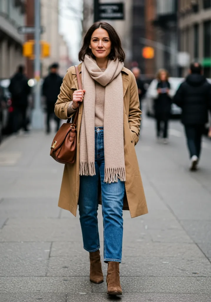 This one’s for the woman who loves an easy, polished look. A soft camel trench layered over a cozy beige sweater and long scarf creates instant warmth and texture, while blue jeans and suede ankle boots keep things grounded and relaxed. The brown leather bag ties everything together with that perfectly lived-in charm.