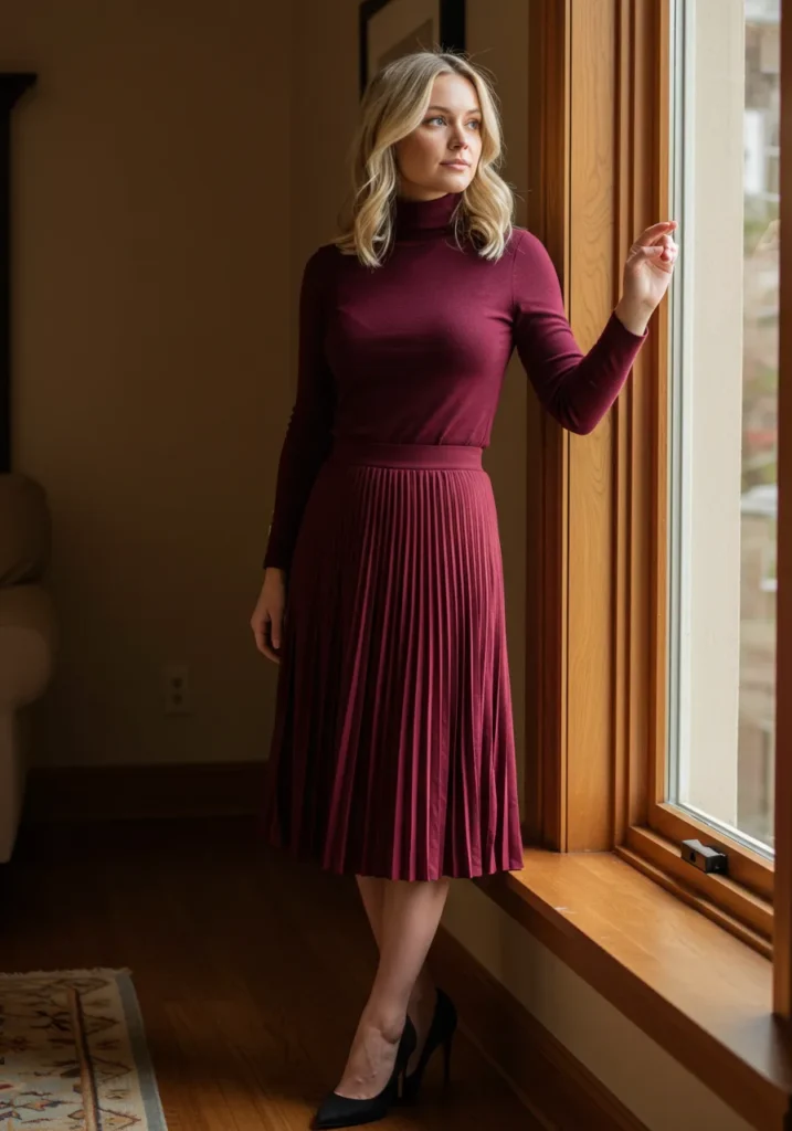This outfit feels like elegance personified. A fitted turtleneck top and a pleated midi skirt, both in a deep burgundy shade, create the most beautiful monochrome moment. Add black heels, and suddenly you’re channeling that effortlessly graceful energy that turns heads the moment you walk into the room.