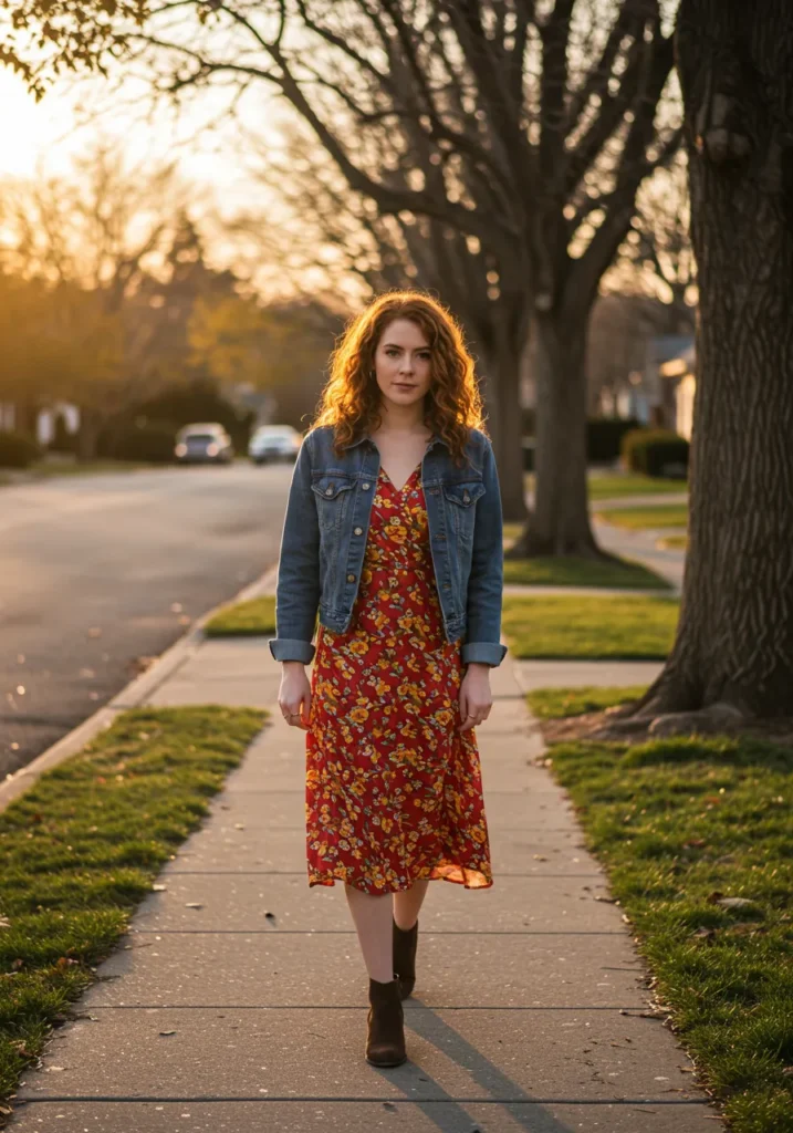A red floral midi dress instantly feels festive, and when you throw on a classic denim jacket, it tones things down in the cutest way. The ankle boots give it just enough edge, making it perfect for that casual family gathering or Friendsgiving celebration. It’s playful, pretty, and still comfy enough to handle an extra slice of pie.