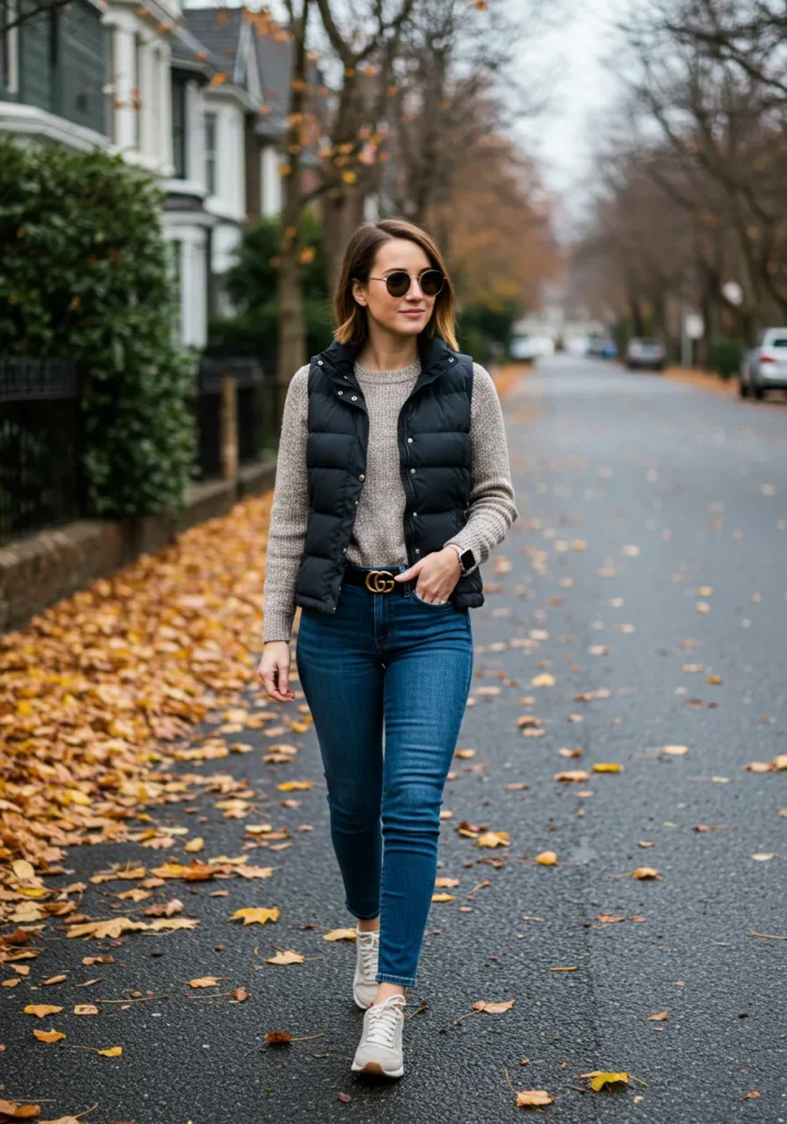 This outfit nails that relaxed yet intentional vibe. A soft neutral sweater tucked into skinny jeans, topped with a black puffer vest, gives instant off-duty style. Add white sneakers, and you’ve got the perfect look for Thanksgiving walks, travel days, or low-key get-togethers.