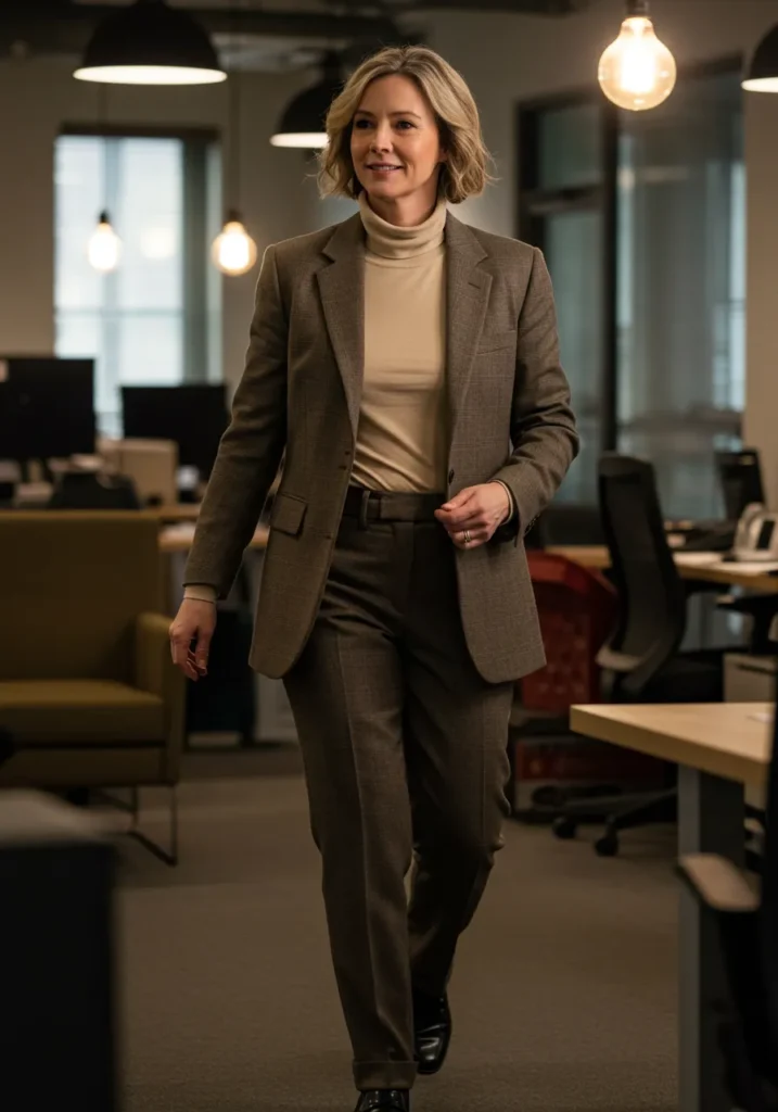 I’m so into how confident this outfit looks without trying too hard. The turtleneck softens the suit, the color palette feels perfectly autumnal, and the whole thing screams understated elegance. It’s giving “I have my life together and still save room for pie.”