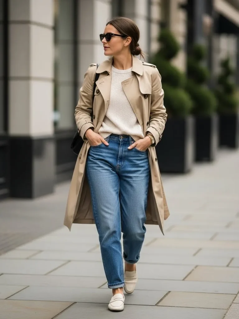 This outfit pairs a soft knit sweater with relaxed blue jeans and a beige trench coat that adds instant polish. The creamy loafers keep the look calm and easy, while dark sunglasses bring a little city chic energy. The pieces feel simple and timeless with fabrics that move well and stay comfortable during a long travel day.