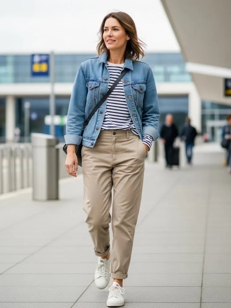 This casual airport outfit features a classic striped tee under a light denim jacket paired with soft beige chinos. The rolled cuffs and white sneakers keep things fresh and easy. The crossbody bag adds convenience and the mix of denim and stripes feels effortlessly cool.
