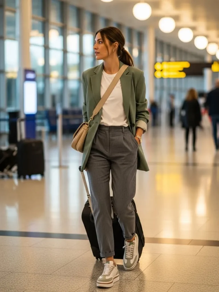 This outfit blends a sage green blazer with a simple white tee tucked into grey tailored pants. The rolled sleeves and relaxed fit make the blazer feel casual while still adding structure. Pale sneakers add a sporty touch that makes the whole look practical for travel. The beige crossbody bag ties everything together.