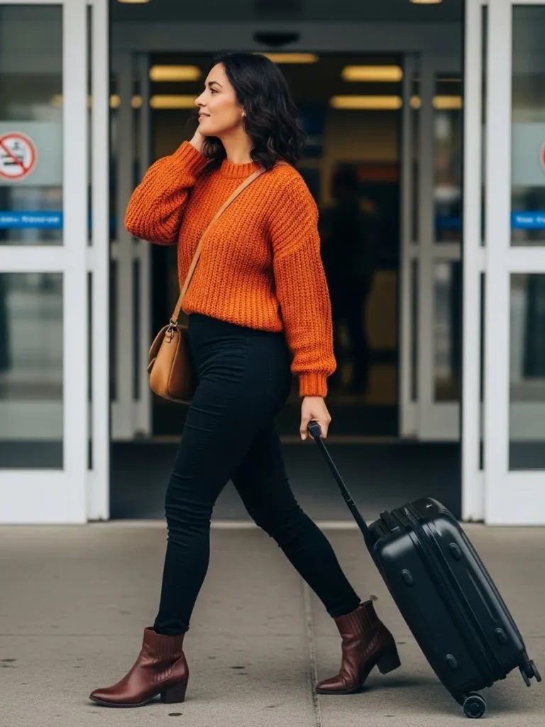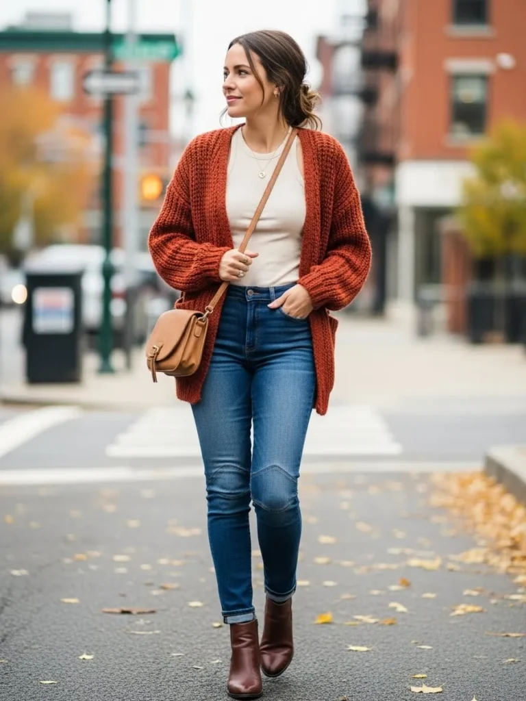 This outfit mixes a chunky rust cardigan with a soft ivory top and classic blue skinny jeans. The warm knit adds texture and comfort while the fitted top keeps things balanced. Brown ankle boots and a tan crossbody bag bring a sweet autumn feel that still works perfectly for airport days. Everything feels soft and relaxed without losing shape.