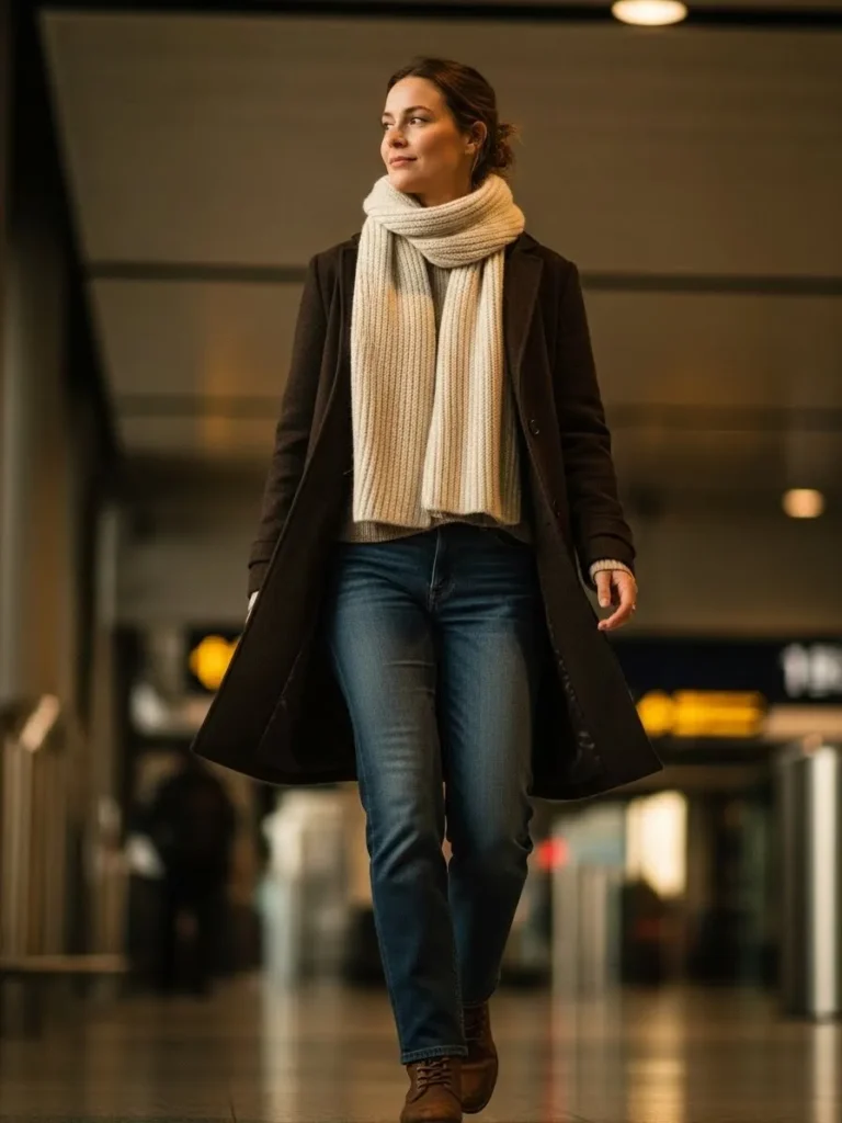 This outfit blends a warm brown coat with a soft knit sweater and classic blue jeans. The cream scarf adds a big cozy layer that feels perfect for cold airports. Brown lace up boots finish the look with a simple and sturdy touch. The mix of textures keeps everything soft and inviting.