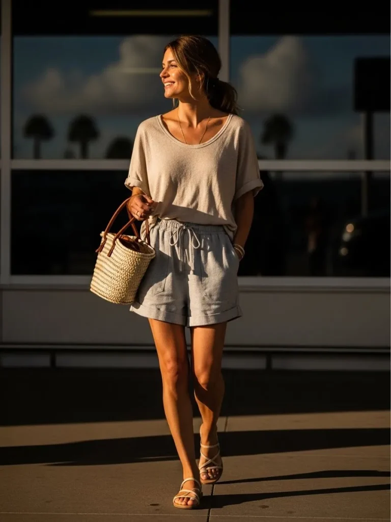 I reach for outfits like this when flying somewhere warm because nothing beats feeling comfortable the moment I land. The shorts keep me cool and the soft tee still looks nice in travel photos. It is such a simple look yet always feels right for summer trips.