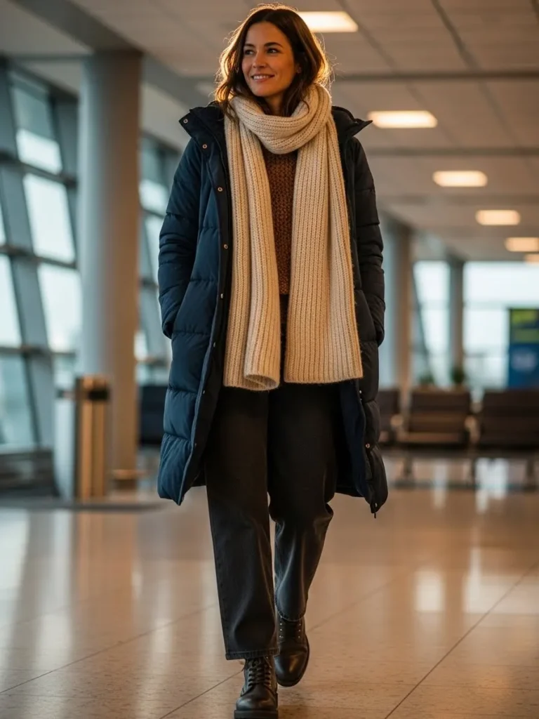 This winter travel look brings together a warm knit sweater, charcoal trousers, and a long padded coat in navy. A thick cream scarf adds extra texture and softness. The dark leather boots ground the outfit and give it a sturdy, confident feel. The rich fabrics make the whole outfit feel warm and inviting.