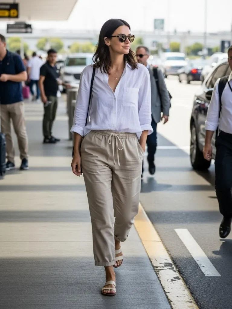 I always appreciate an outfit that stays comfortable without losing its charm. The linen shirt feels classic and the loose pants help me stay comfortable through long lines and warm terminals. It is a go to look when I want something clean and calm for travel days.