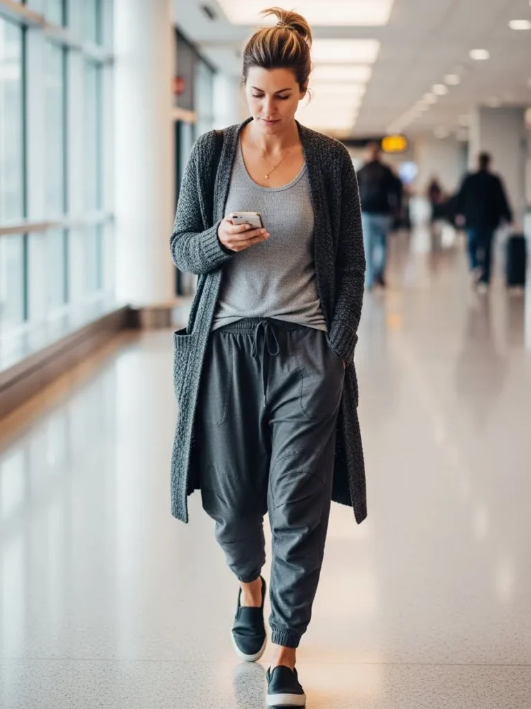 This look is all about easy comfort with a soft grey tank paired with relaxed charcoal joggers and a chunky open knit cardigan that adds warmth without feeling heavy. The colors stay neutral and calming which makes the whole outfit feel effortless. Slip on sneakers keep everything practical for long walks through the terminal and the low bun adds to the relaxed vibe.