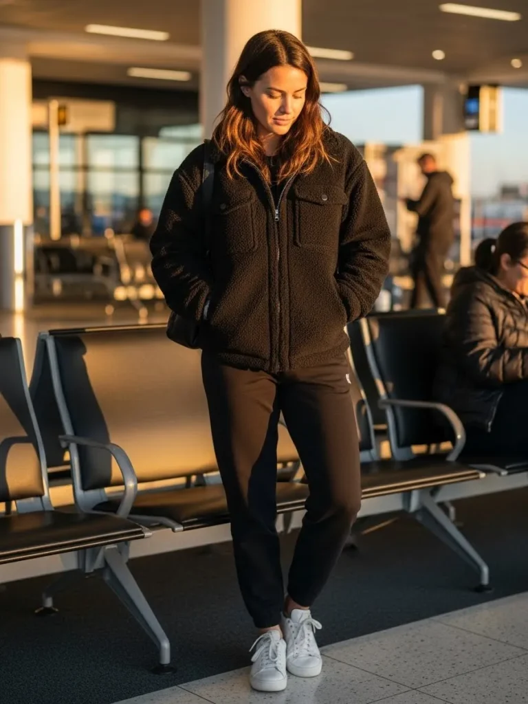 I love this kind of jacket for long flights because it is warm without being heavy. The joggers move easily and the sherpa gives me that extra comfort I always want when I know the flight will be long. It is practical and cozy with a little bit of edge.