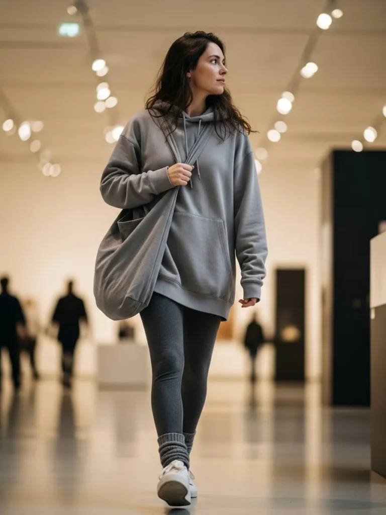 I always like outfits like this when I know I will be walking a lot. The hoodie adds warmth the leggings feel supportive and the sneakers are a lifesaver. It is comfortable without feeling sloppy and that balance makes me happy every time.