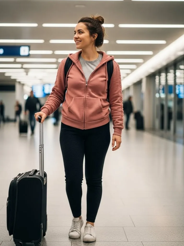 This look mixes a soft pink zip hoodie with a grey tee and textured black leggings that stretch easily through long hours of sitting. The white sneakers and backpack keep everything sporty and practical which makes navigating the airport feel smooth and comfortable.