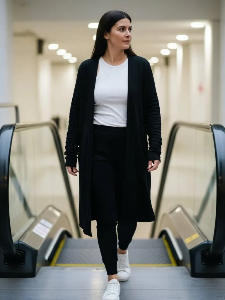 This outfit blends a fitted white ribbed top with black joggers and a long black cardigan that adds a sleek layer of warmth. The white sneakers brighten the look while keeping it relaxed. The monochrome palette makes everything feel clean and classic.