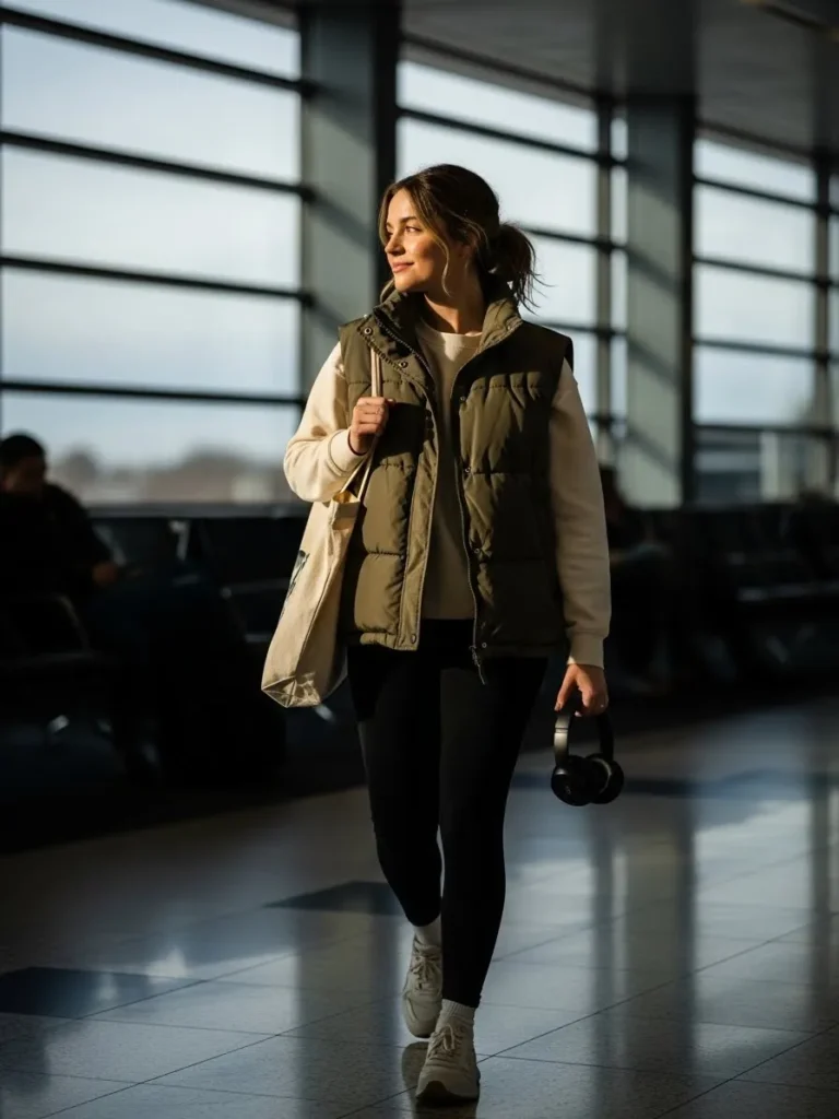 This look features black leggings paired with a cream sweatshirt and topped with an olive puffer vest that adds warmth without bulk. White sneakers keep things fresh and the tote bag makes carrying essentials easy. The sunlight hitting the outfit gives it a soft warm vibe that fits perfectly with travel days.