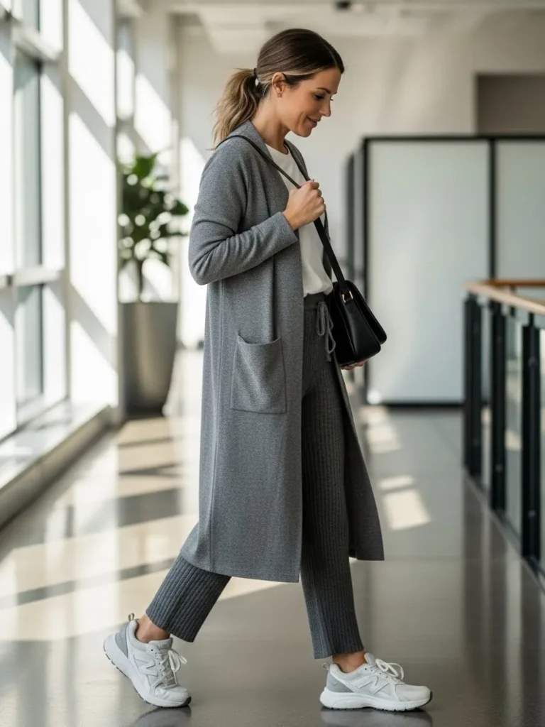 This outfit blends ribbed grey knit pants with a matching long cardigan and a simple white tee underneath. The white sneakers give the outfit a fresh sporty touch while the long cardigan keeps everything soft and warm. The monochrome palette makes the entire look feel calm and elevated.