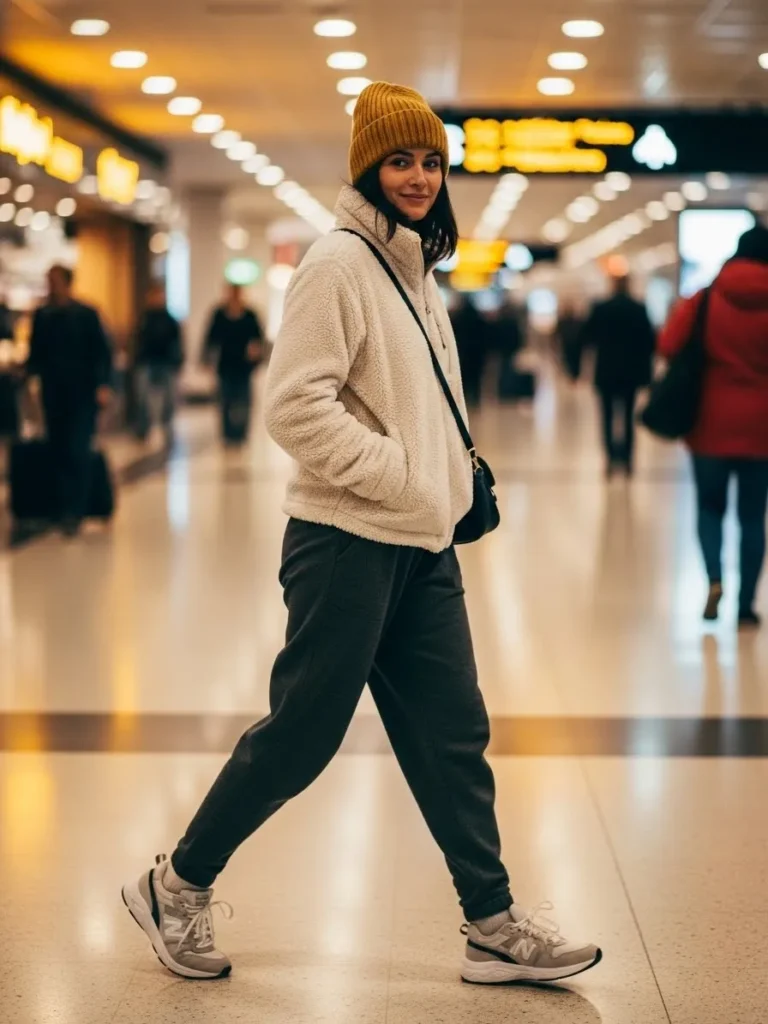 This outfit features a soft cream sherpa zip jacket paired with dark charcoal joggers that feel relaxed and warm. The mustard beanie adds a fun pop of color while the grey sneakers keep everything practical for walking long terminals. The textures make the whole look feel snuggly which is perfect when the airport AC is blasting.