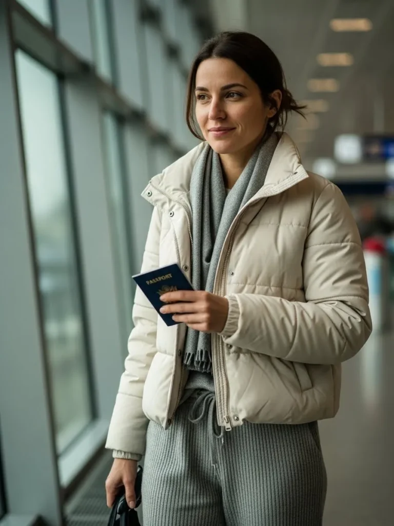 I reach for looks like this when I know the cabin will run cold because the textures feel so comforting. The puffer and scarf make waiting at the gate more pleasant and the ribbed knit keeps the whole outfit feeling refined. It is warm travel style done right.