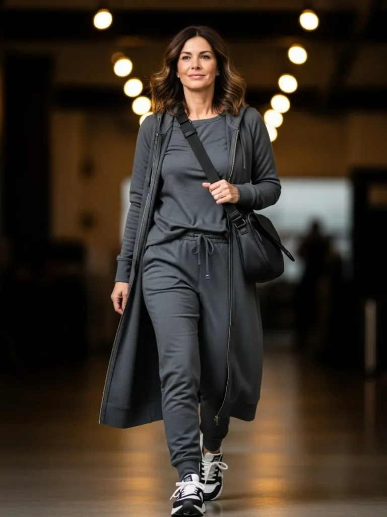 This outfit brings together a charcoal lounge set topped with a matching longline zip hoodie that creates a sleek coordinated look. The joggers and tee feel soft and stretchy and the black crossbody bag adds a practical touch. The sneakers keep everything comfortable for airport walking.