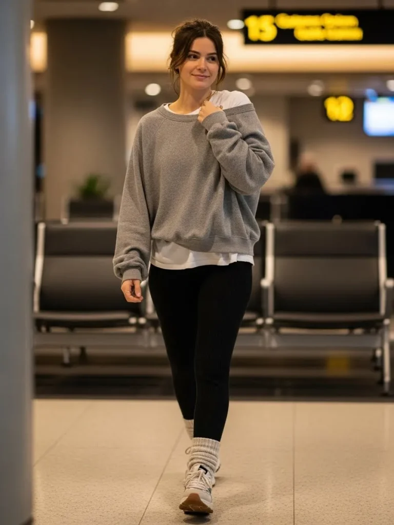 This outfit pairs a relaxed grey sweatshirt with black ribbed leggings and thick grey socks tucked into sneakers. The layered white tee peeking out adds a cute touch and makes the outfit feel softer. Everything looks comfortable and easy to move in which is perfect for navigating busy terminals.
