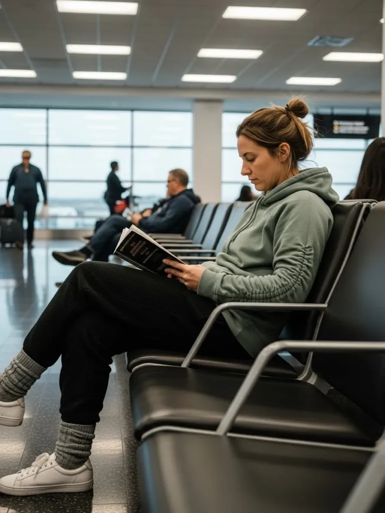 This outfit blends a muted green hoodie with black textured joggers and cozy grey socks tucked into classic white sneakers. The whole look feels warm and relaxed which is exactly what I want when I am waiting for a long flight. The messy bun just adds to the easy vibe.