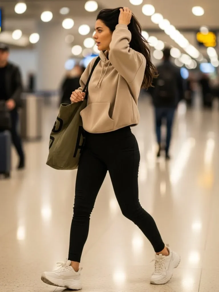 This look combines a soft beige hoodie with sleek black leggings and chunky white sneakers that make airport walking a breeze. The oversized tote adds a practical touch for carrying all the travel essentials. The warm beige top makes the outfit feel soft and relaxed while still looking clean.