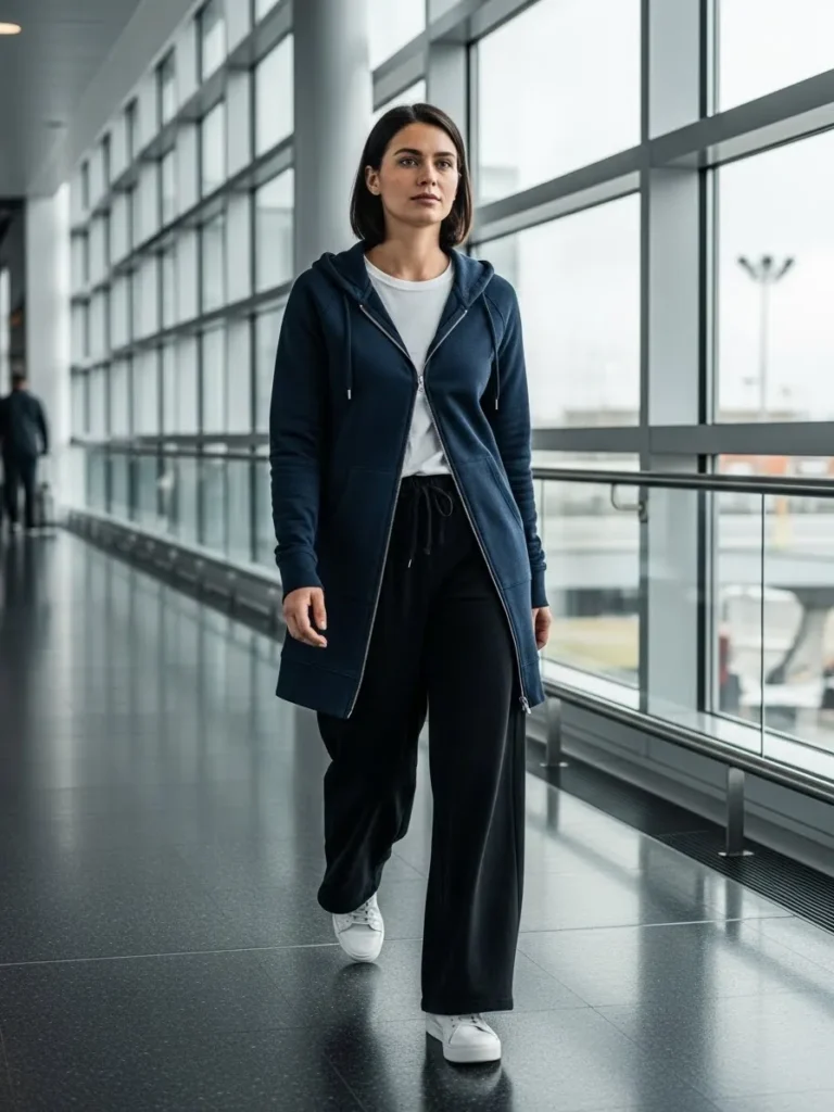 I love matching sets because they make me look way more put together than the effort it takes. The long hoodie adds warmth without bulk and the whole outfit moves easily. It is the perfect cozy uniform for long flights.